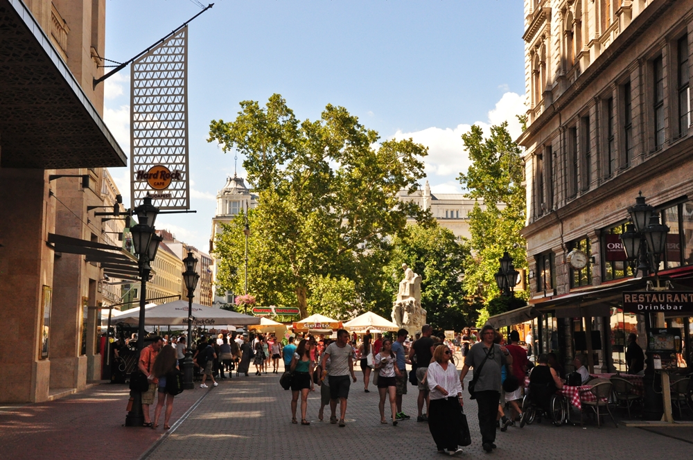 Öncelikle Hard Rock Cafe Budapeşte’nin de yer aldığı Vörösmarty Meydanı’na gittik. Peşte kısmının atardamarlarından biri olan bu meydanda alışveriş yapabilir, labirenti andıran ara sokaklarında kaybolabilir ve en önemlisi sokak satıcılarından yerel lezzetleri tadabilirsiniz. Turistik bir bölge olduğu ve Peşte kısmının tüm önemli noktalarına yürüme mesafesinde olduğu için şehrin diğer kısımlarına göre fiyatlar biraz daha pahalı. Burada bir Turizm Ofisi bulunduğunu belirtmekte de fayda var.